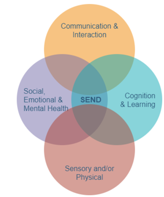 There are 4 broad areas of SEND identified within the Code of Practice. Individual children or young people may have needs in one area or across several areas and their needs may change over time.